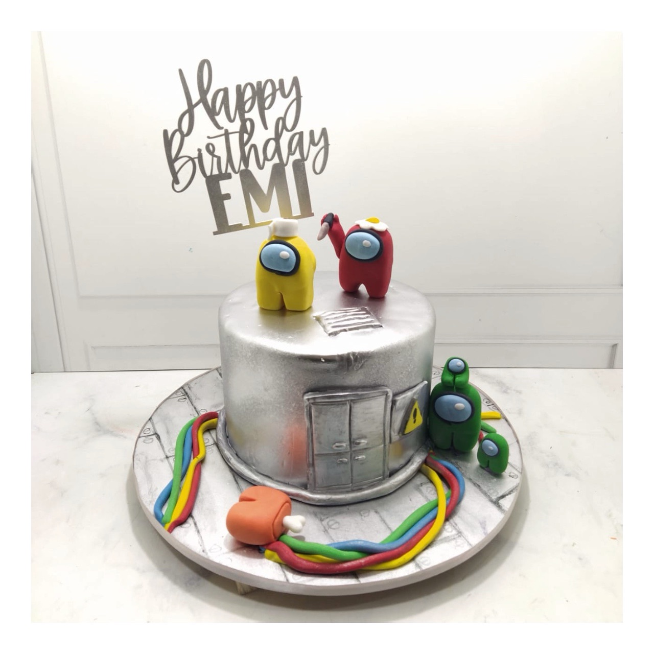 Pastel de Fondant con figuras 3D y base pintada