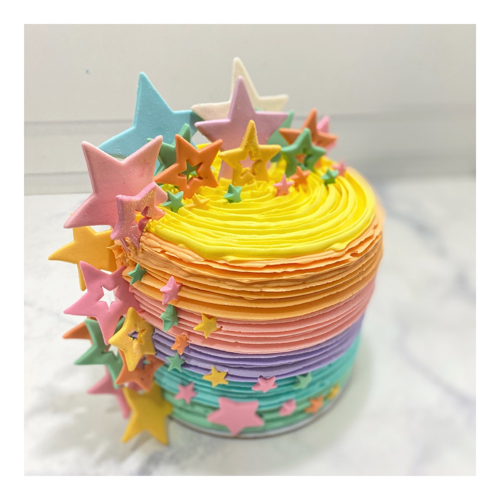 Pastel de betún con acabado "lined cake y estrellas de fondant" de diferentes tonos. Simpre recomendamos que sean del tono más claro (arriba) al tono más obscuro (abajo). Esto para que los niños no se manchen con el color más obscuro.