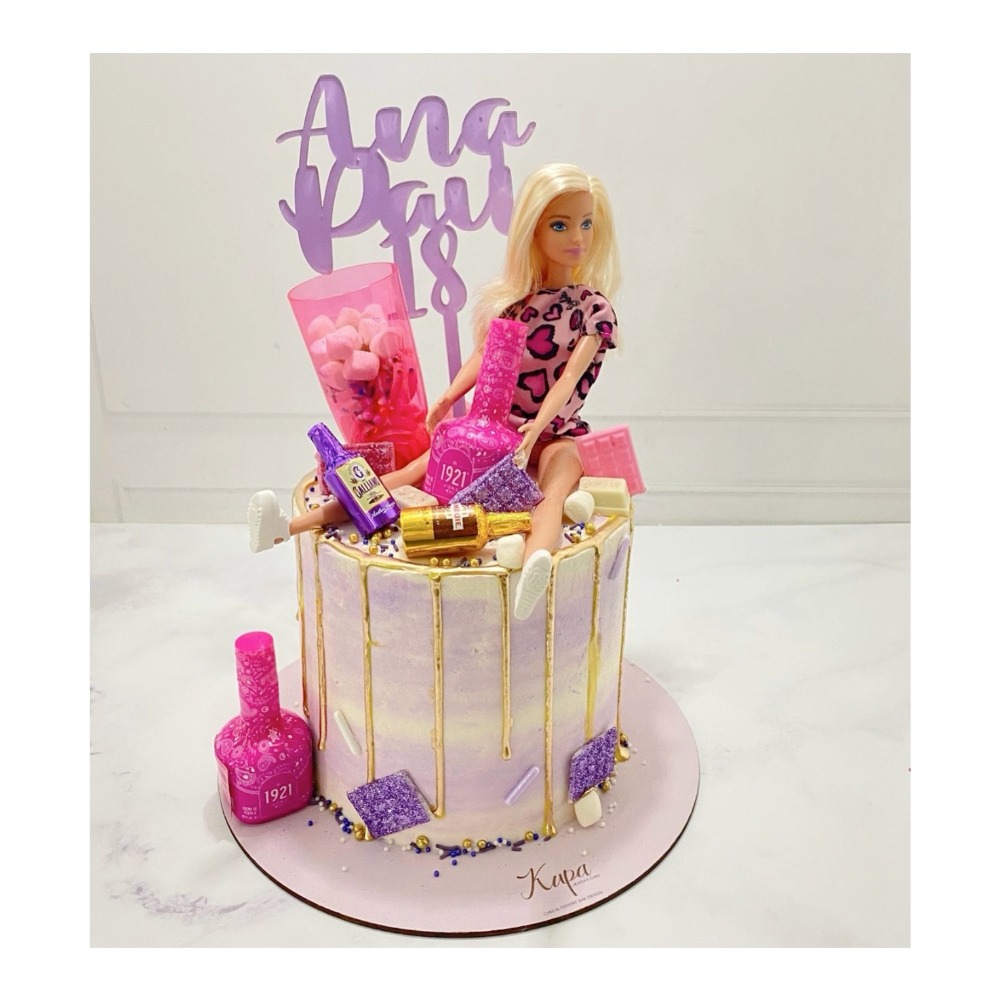 Pastel de betún "drip" con decoraciones de fondant y 1 barbie