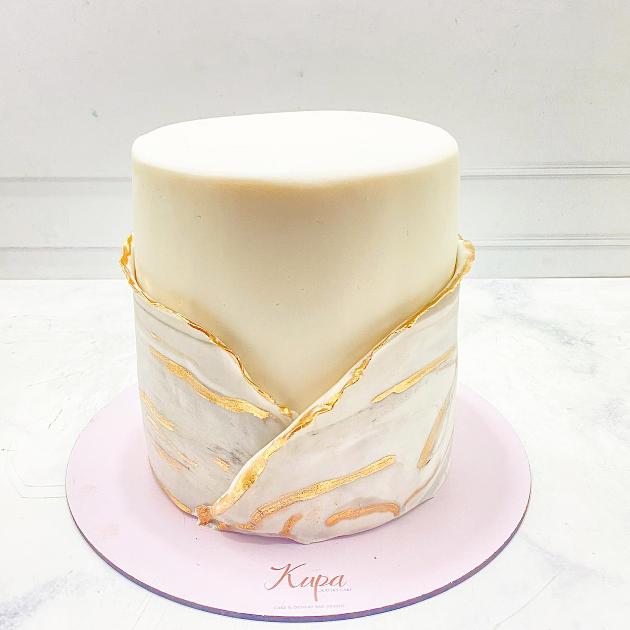 Pastel de fondant marmoleado con efecto envoltura y detalles dorados