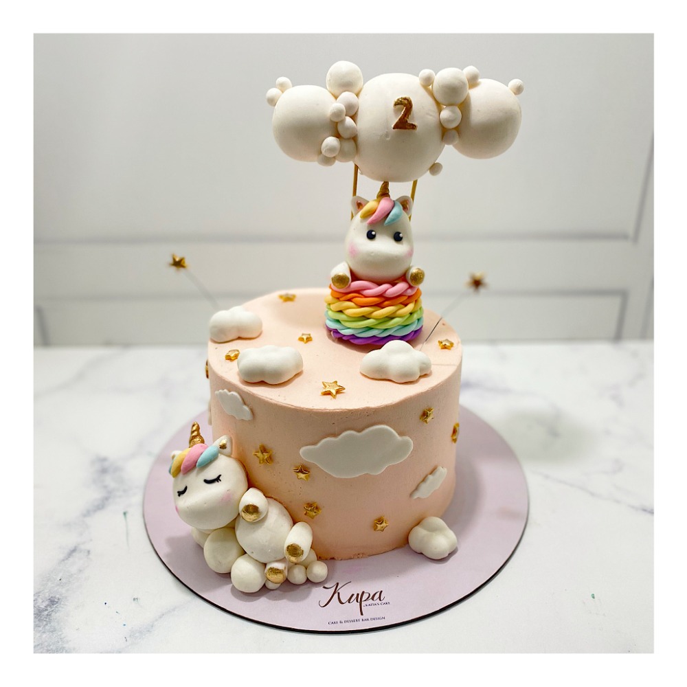 Pastel de betún con 2 unicornios y decoraciones y figuras 3D