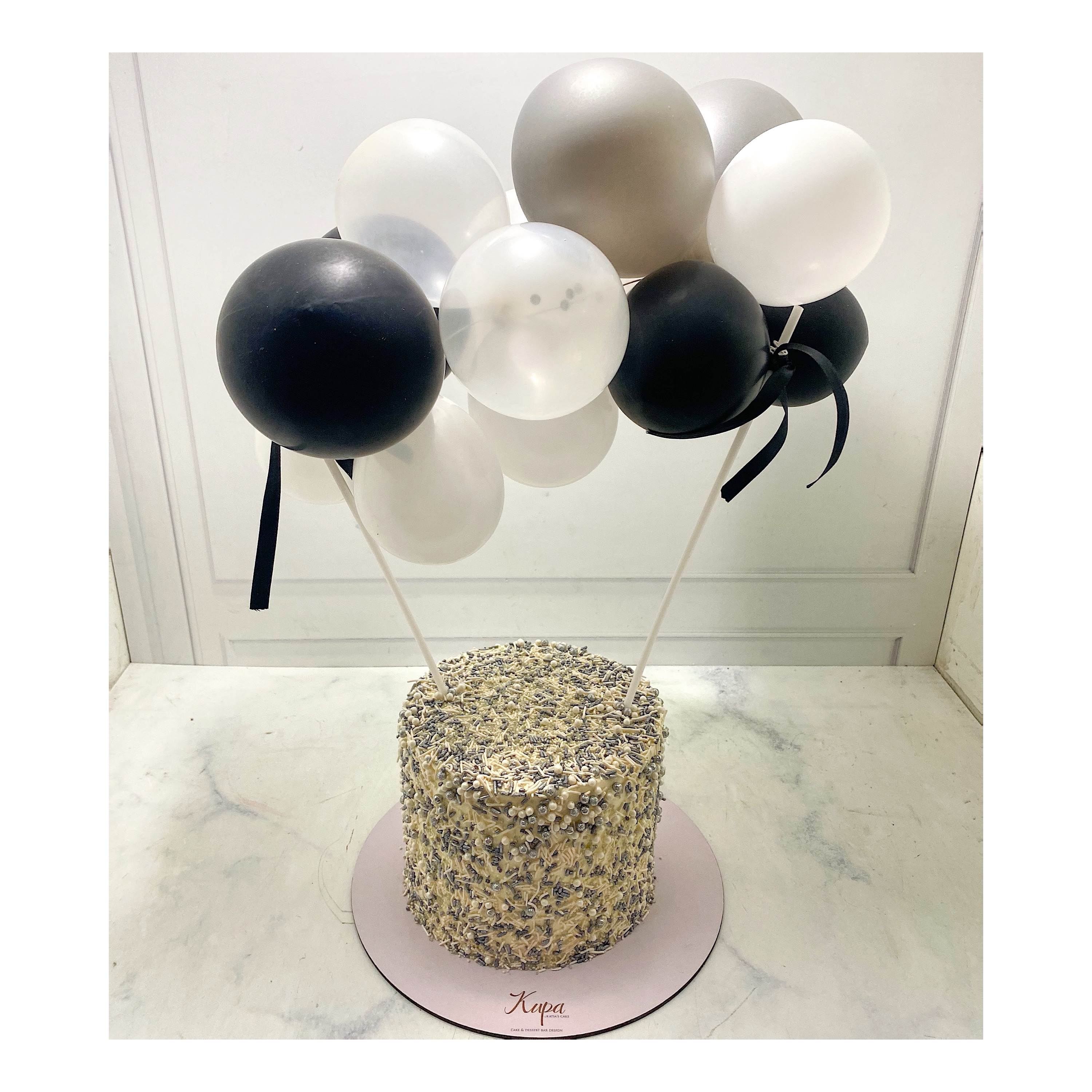Pastel de betún con sprinkles B&W y guirnalda de globos