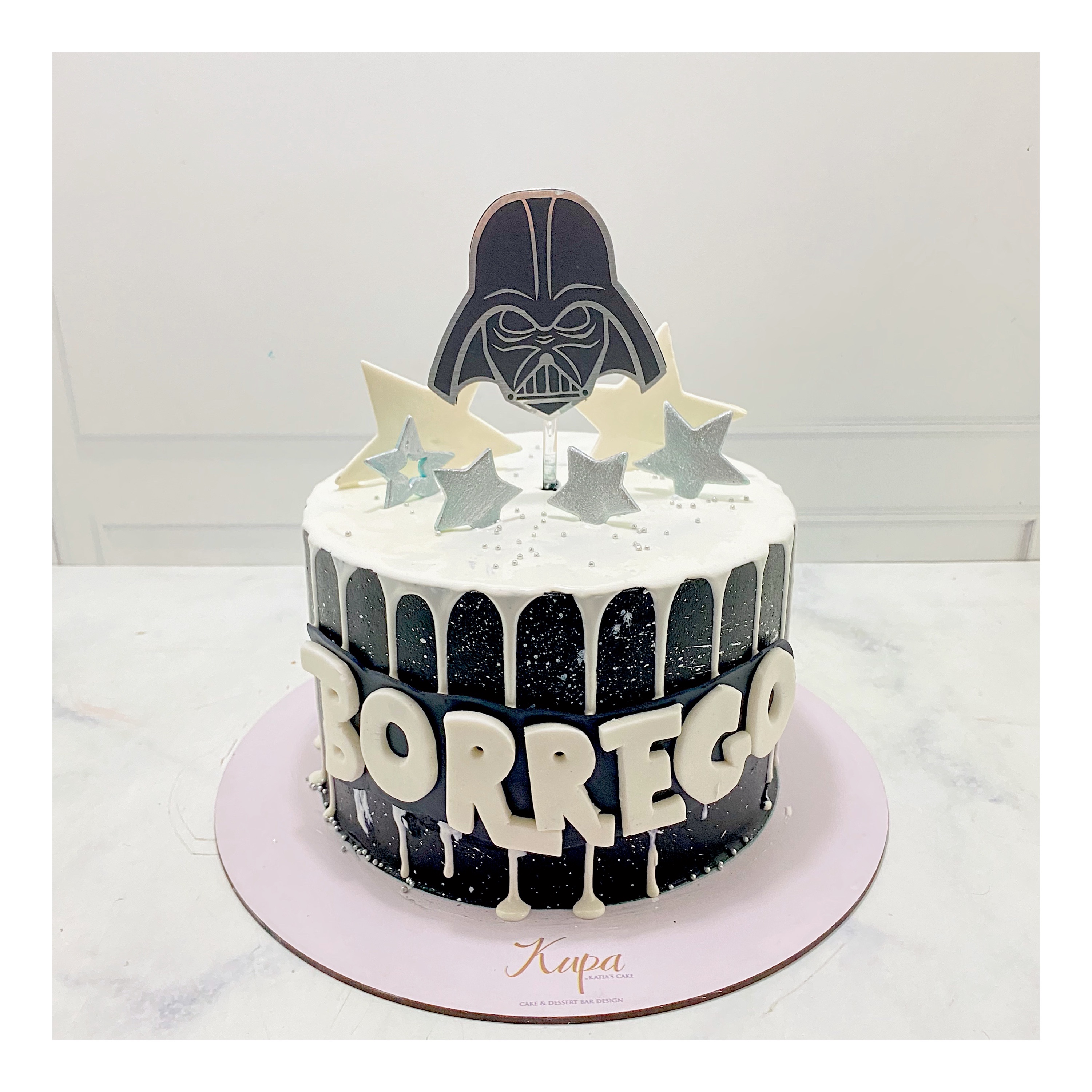 Pastel de betún con Dark Vader en cartulina y estrellas de fondant