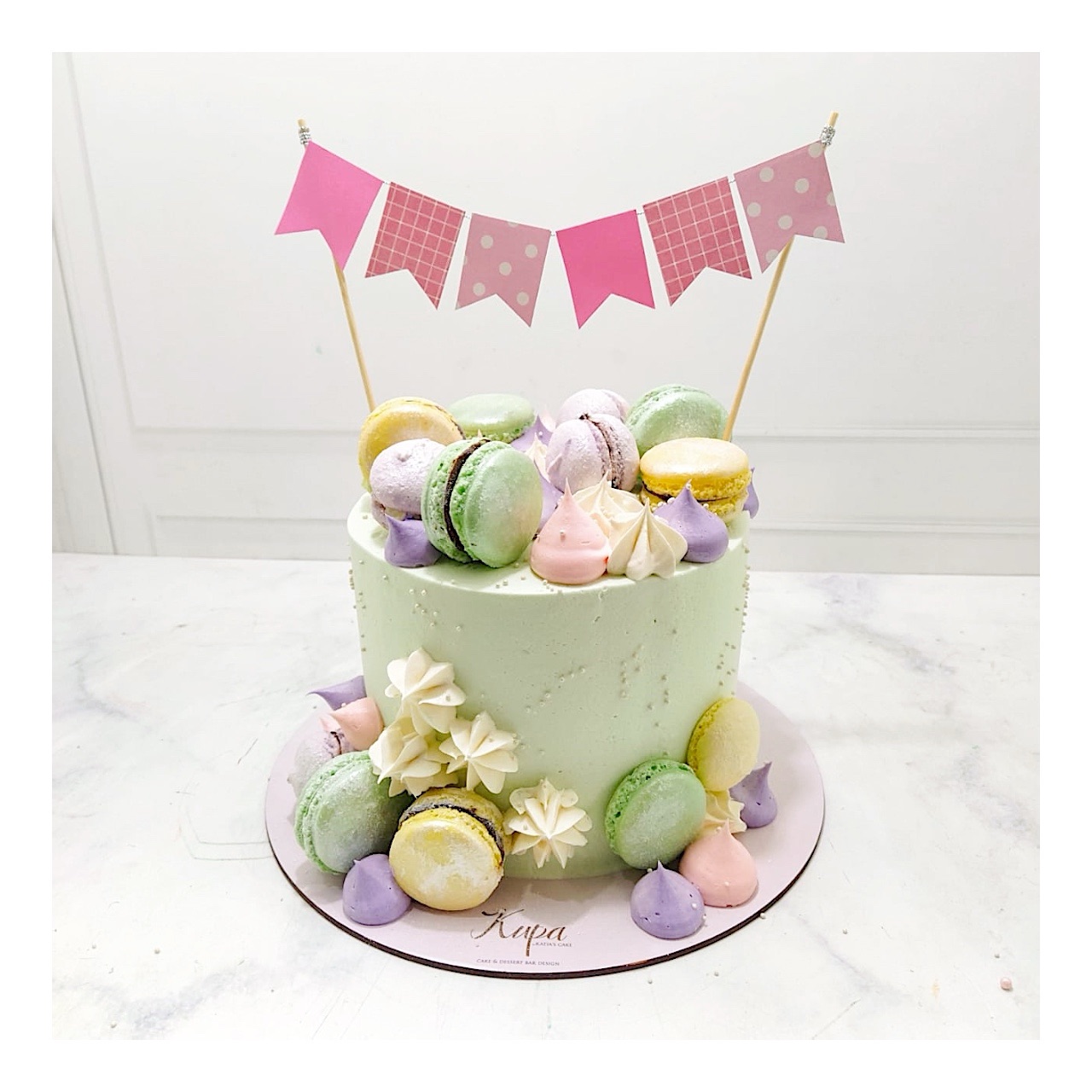 Pastel de betún con macarons y cake topper de banderines de papel