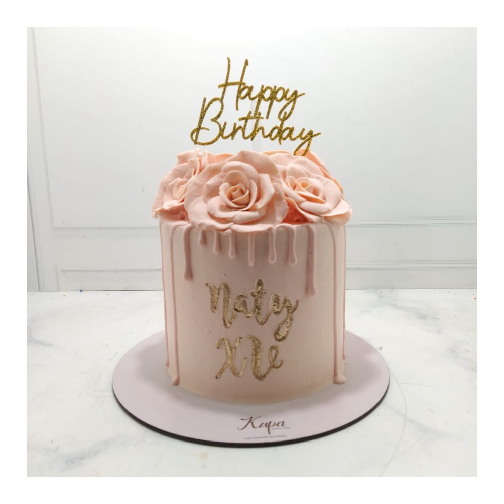 Pastel de betún "drip", flores de fondant y letras doradas