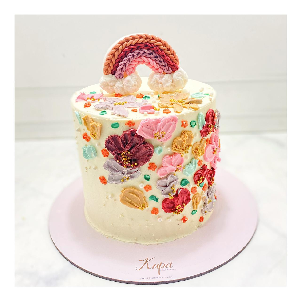 Pastel de betún, flores de colores en betun y figura 3D fondant